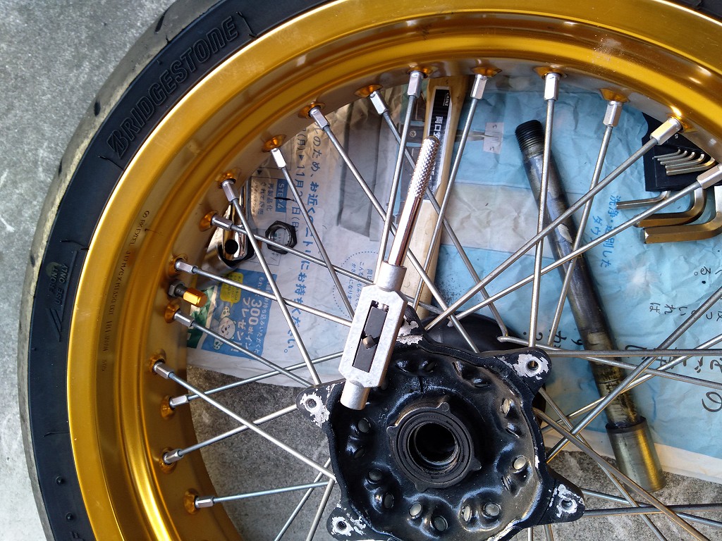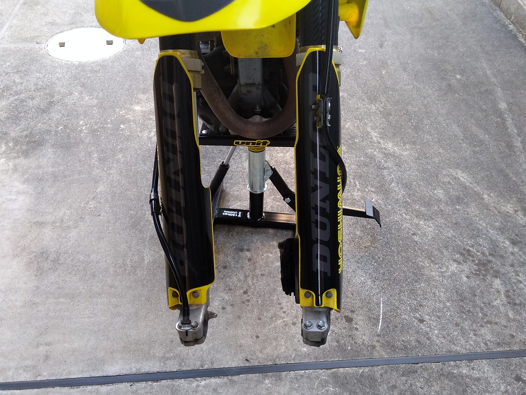 本命のフロントブレーキディスクの交換。Unitのリフトスタンドは、最低地上高が低いので少し持ち上げればモタードの車体の下に入る。ただ、天板を固定できないのでちょっと不安定。