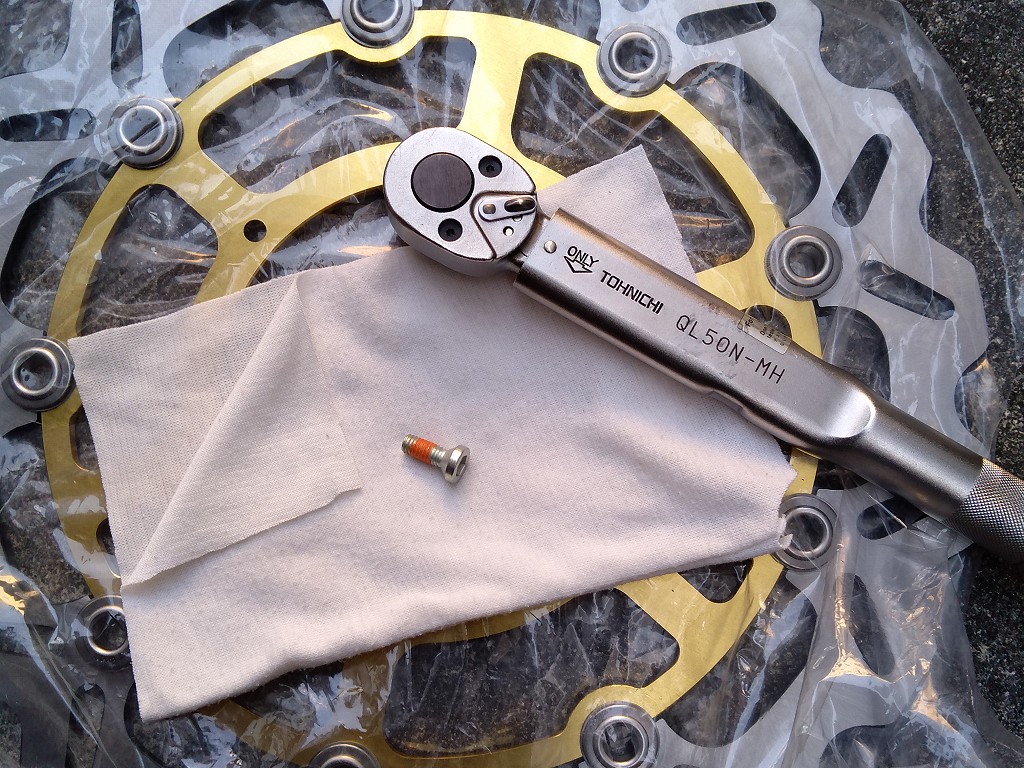 取り付け準備中。純正のボルトは固形のネジロックが塗布済みだった。そして20年以上使用してる東日のトルクレンチ。使用頻度自体はそれほどでもないが、検定に出した方が良いのかどうか。