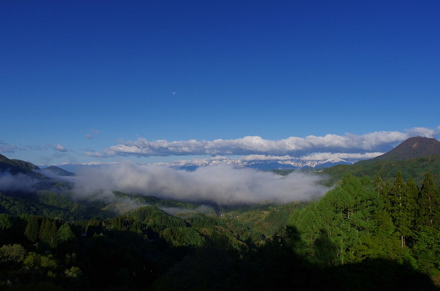 戸隠から鬼無里へ向かう県道36号にある大望峠の展望台からの日本アルプス。朝が早すぎて雲が晴れていないけど、天気が良ければやや遠いけど日本アルプスと戸隠山が一望できる。なお、県道36号はここ以外にはあまり展望の良い場所はなかったりする。
