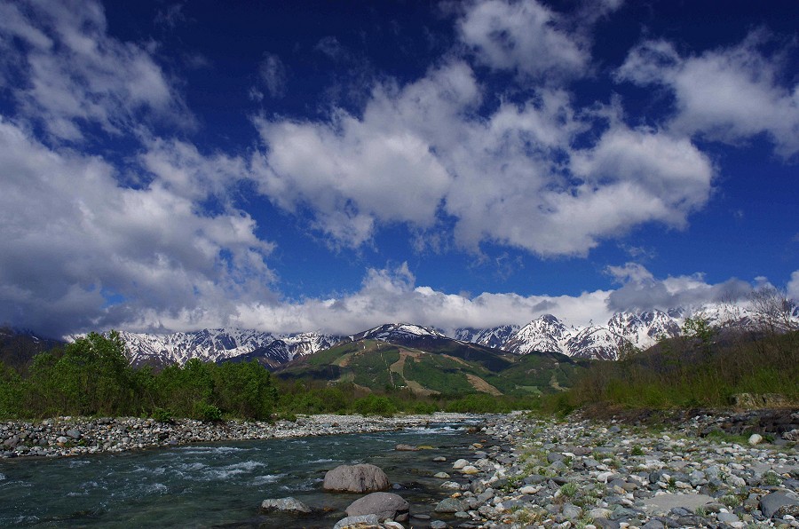 白馬の姫川の河原から撮った一枚。橋の上からより煽るように撮れるし、姫川の周辺はバイクを止めても邪魔にならないスペースがある(撮影スポットまでは当然歩くが)ので横着しないほうが良い。