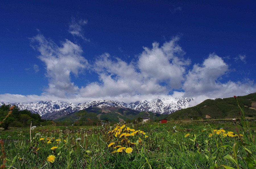 白馬を南北に縦断する国道148号付近は駅の周り以外は田畑が多い。連休から2週間程度でそれまで茶色が強かった地面にもあっという間に緑になっていた。