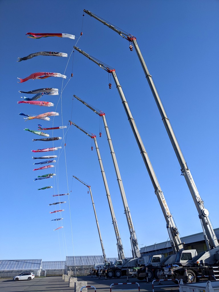 GW のツーリングで一番面白かったのは、写真のクレーン車であげられた鯉のぼりだ。