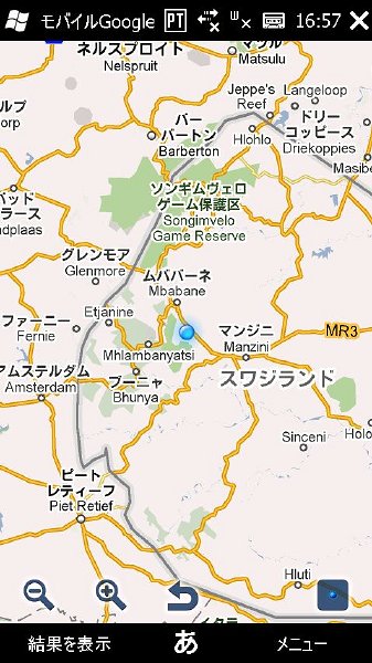 画像は埼玉県内の自宅から1時間程度の距離にあるローソンで一服しているときに、試しにMobile Google Mapsで現在位置の地図を表示したところ。さいたま帝国はいつの間にかにスワジランドを手に入れていたらしい(それでも海が無い!)。