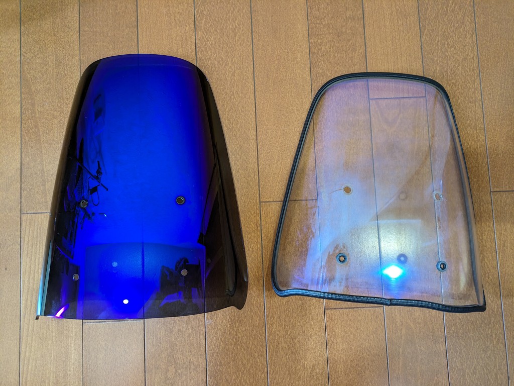 カタナを買ってすぐに交換したチタンコートスクリーンを20数年ぶりに交換した。写真では屋内かつ古い方はクリアベースなので透き通って見えるけど、薄くはなっているもののコーティングが剥がれることは無かった。なお、ヘルメットのシールドのコーティングは北海道で虫を潰しまくって数日で剥がれたが、スクリーンは耐えてくれた。