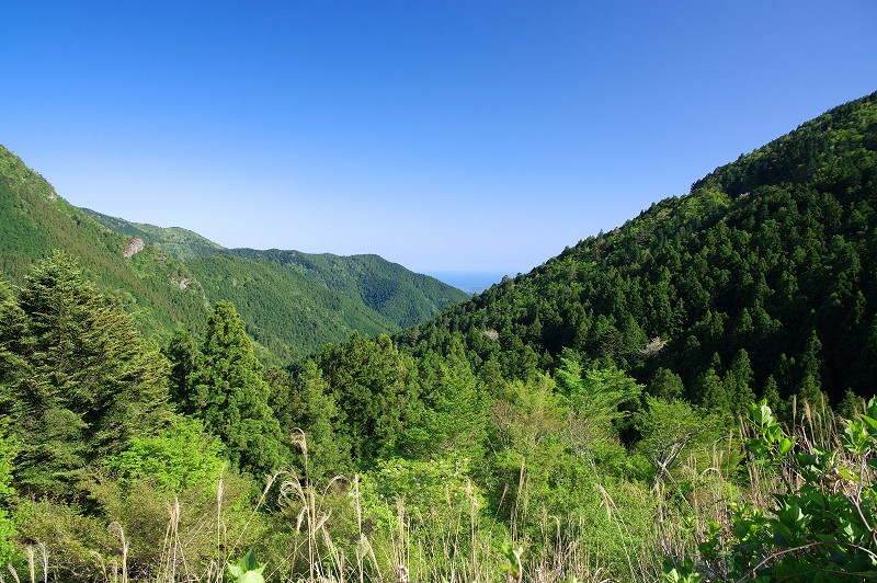 早明浦から県道16号で高知方面へ向かう途中。山の合間から海が見える。ぱっと地図を見て、なんとなく長野の立科を走るR142くらいの道だと思いこんでいたらめっちゃ山道で、さすが四国と思い知らされた。