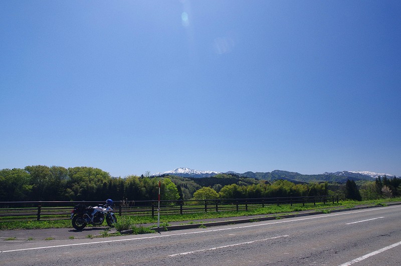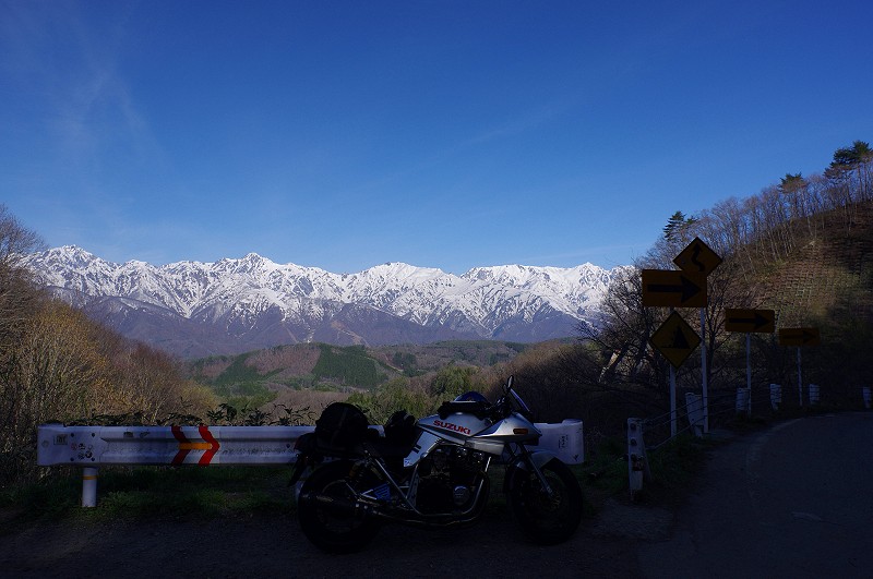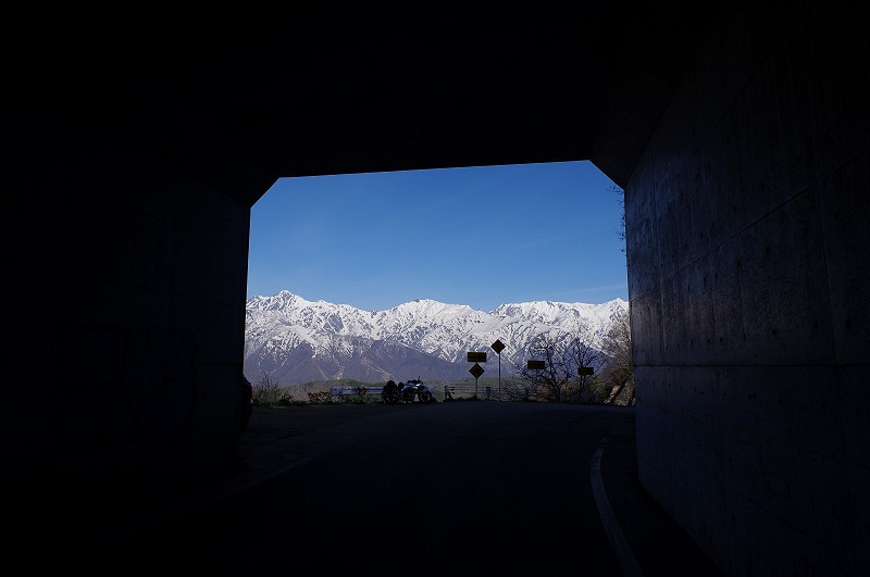 大望峠展望台から県道を進み鬼無里で国道406に合流し西に向かう。裾花川沿いを進んでいる間は走りやすいが、川を離れると山手に入り道は狭く展望がなくなっていく。徐々に標高を上げて谷が深くなって行くと嶺方峠手前でトンネルになる。実際にはトンネルの手前にスノーシェッド(?)がありカーブしているためトンネル手前からは向こう側が全く見えないが、暗いトンネルを進むと次の写真のような感じでいきなり日本アルプスが眼前に現れる。