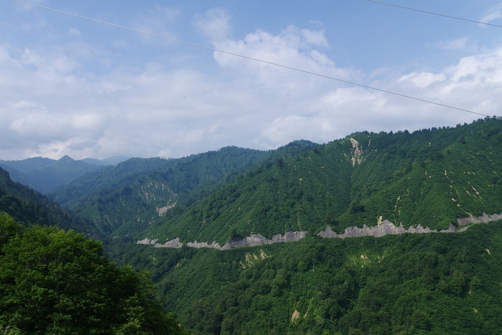 新潟寄りの最後の突端から見た奥只見湖。乗用車なら一台泊まれるかという程度のスペースはあるけど、別に展望所とかではないのでこの写真はそこから少し歩いて移動して撮った。