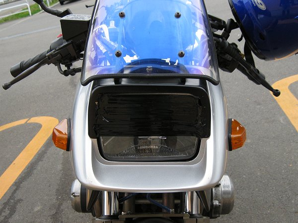 本には「ヘッドライトの上にガムテープを貼って」と書いてあったが、実際貼ってみるとマルチリフレクターだからなのか、正面への光を遮れてないようだった。