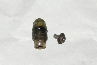 ニードルバルブを固定しているボルト(画像の右のボルト)が真っ赤に錆び付いていた。その錆はニードルバルブの方にまで広がって隙間に入り込んでいるようだった。とにかくボルトを外して状態を確認しようと千枚通しでボルトの錆を落としてみると、このボルトもナメていた。この時の嫌な感じがしたが、これはあまりよろしい感情ではないけど正直に書いておく。